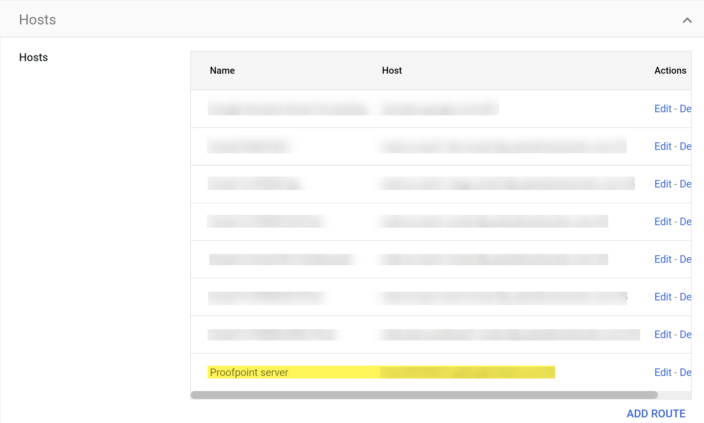 Back in the Hosts page, verify that the Proofpoint server route is displayed.
