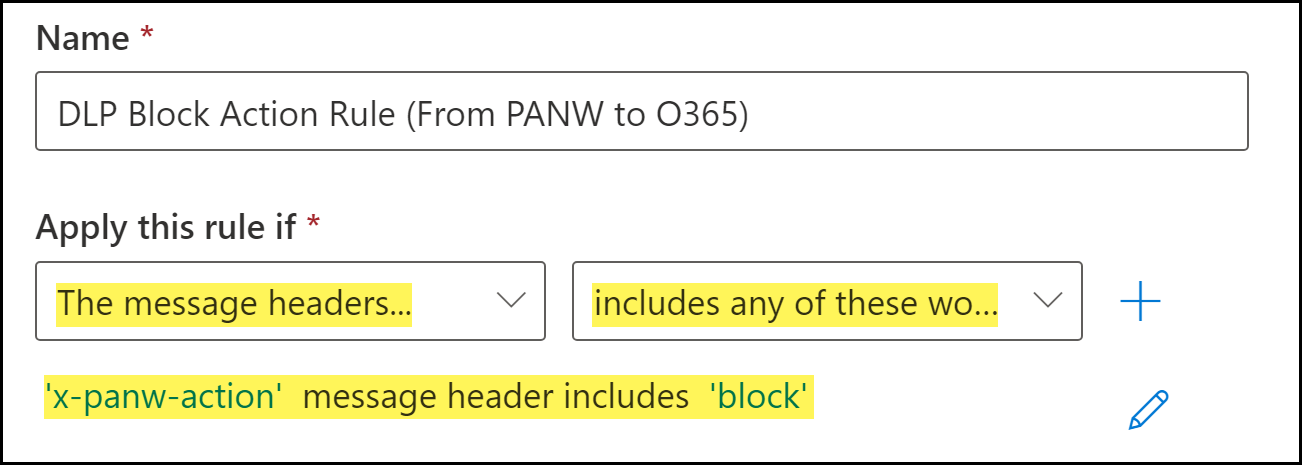 - BlockInstructs Microsoft Exchange on the action to take when Enterprise DLP returns a Block verdict for an email that contains sensitive data.Enterprise DLP adds x-panw-action: block to the email header for all inspected emails. Any future emails with this header already included will not be forwarded to Enterprise DLP for inspection. Instead, Microsoft Exchange takes the action specified in the Block transport rule.