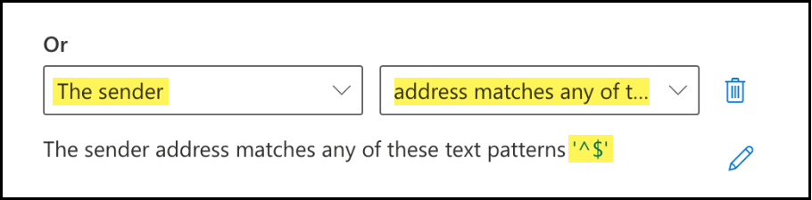 ![]() Add an exception for emails where the sender is blank or empty. Add an exception for emails where the sender is blank or empty.- In the Except if condition, click the add symbol () to add a new Or condition.![]()