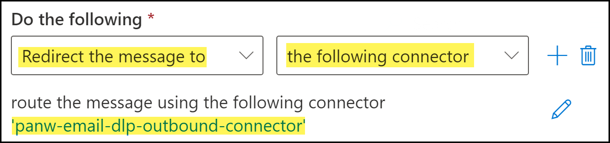 - Click Enter Text. When promoted, enter the following.x-panw-actionClick Save to continue.Click Enter words. When prompted, enter the following and Add:encryptSelect the word you added. Click Save to continue.![]() Specify the action Microsoft Exchange takes when an email header includes the encrypt header added by Enterprise DLP. Specify the action Microsoft Exchange takes when an email header includes the encrypt header added by Enterprise DLP.- For Do the following, select Redirect the message to.