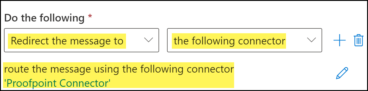 ![]() Specify Microsoft Exchange Connector you created as the transport target for email inspection. Specify Microsoft Exchange Connector you created as the transport target for email inspection.- For Do the following, select redirect the message to.