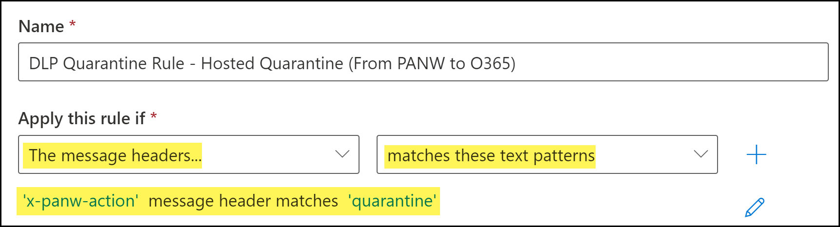 ![]()  Create a Microsoft Exchange Hosted Quarantine Transport RuleCreate a Microsoft Exchange Quarantine transport rule to quarantine and forward a quarantined email to Microsoft Exchange hosted quarantine for approval after inspection by Enterprise Data Loss Prevention (E-DLP).Microsoft supports email approvals on the web browser-based Microsoft Exchange only. Approving or rejecting emails on the Microsoft Exchange mobile application or desktop client is not supported.- Log in to the Microsoft Exchange Admin Center.Create the outbound and inbound connectors.Skip this step if you have already created both the outbound and inbound connectors.Select Mail flowRulesAdd a ruleCreate a new rule to create a new email transport rule.![]() Configure the quarantine transport rule conditions. Configure the quarantine transport rule conditions.- Enter a Name for the quarantine transport rule.Add the quarantine email message header.The quarantine header is added by the DLP cloud service when an email contains sensitive information that needs to be approved by your email administrator.- For Apply this rule if, select The message headers....