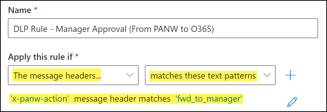 - Manager ApprovalInstructs Microsoft Exchange to forward the email to the sender's manager when Enterprise Data Loss Prevention (E-DLP) cloud service returns a Forward email for approval by end user's manager verdict for an email that contains sensitive data.Enterprise DLP adds x-panw-action: fwd_to_manager to the email header for inspected emails. The email is transported back to Microsoft Exchange so a manager can review the email contents and decide whether to approve or block the email. Any future emails with this header already included will not be forwarded to Enterprise DLP again. Instead, Microsoft Exchange will take the action specified in the transport rule.