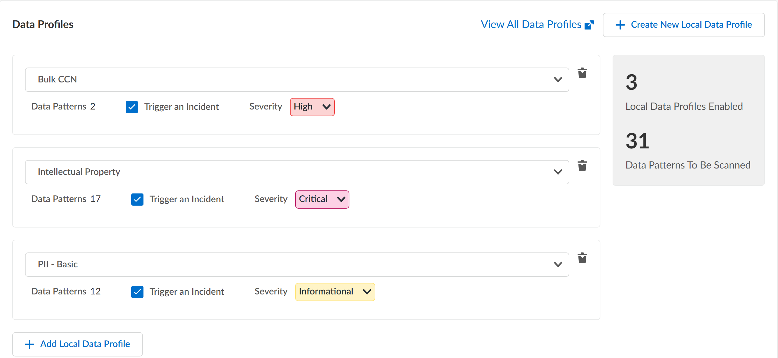 Add an Endpoint Compatible data profile to the Data at Rest policy rule.- Add Local Data Profile to search for and select an Endpoint Compatible data profile.Select whether inspected files on the endpoint containing sensitive data Trigger an Incident.This setting applies per data profile. Enterprise DLP generates a DLP incident if Prisma Access Agent detects sensitive data in a file that matches the data profile.If you enabled Trigger an Incident, select the Severity of the generated incident.The severity applies to all incidents generated by this data profile. You can select Critical, High, Medium, Low, or Information.Repeat this step to add as many Endpoint Compatible data profiles as needed.