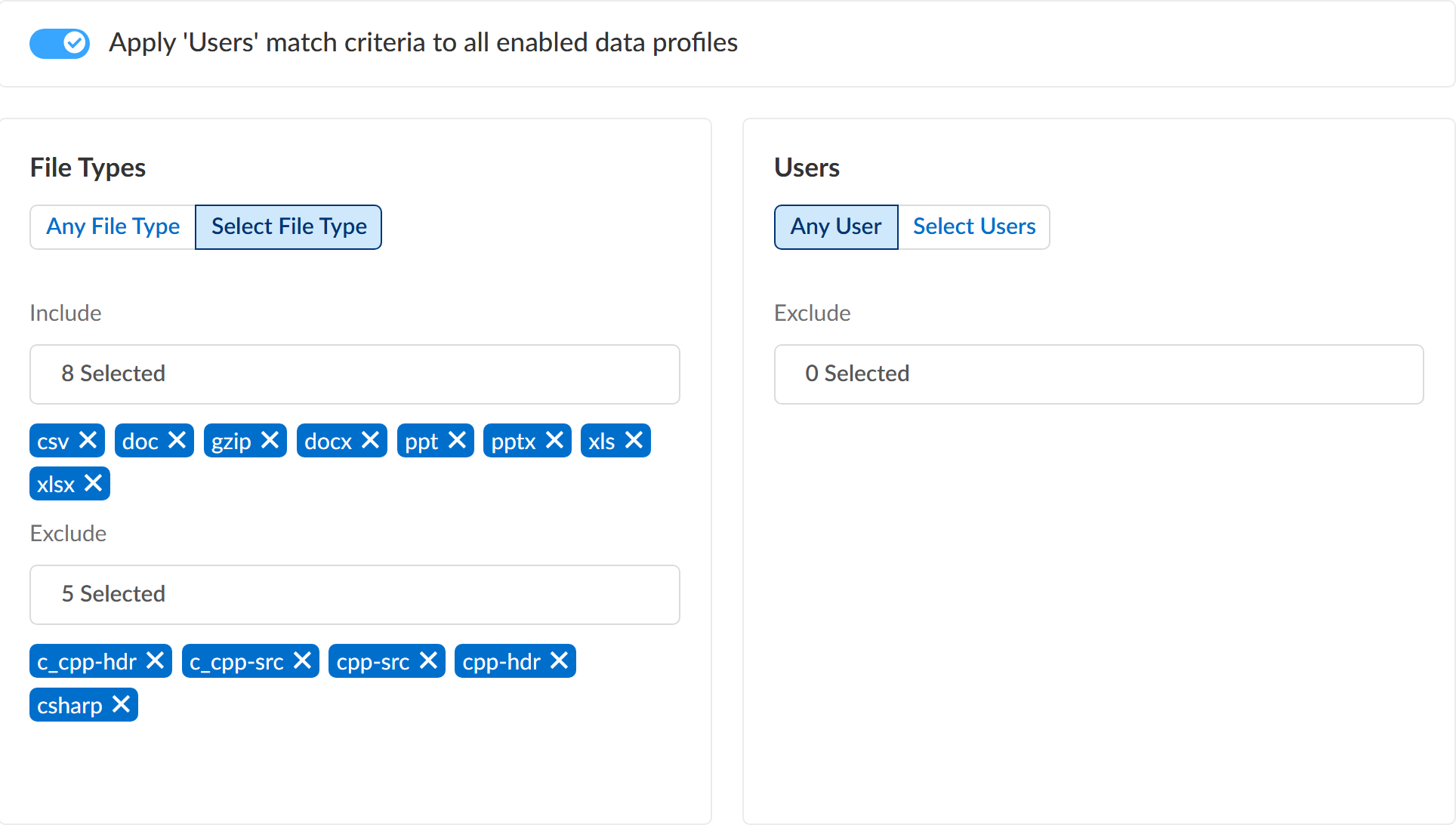 Configure the User scope to define which users the data at rest policy rule applies to.- Enable Apply Users match criteria to all enabled data profiles.Select the Users whose endpoints you want to scan.
