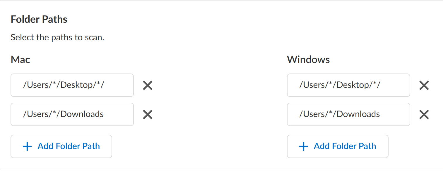 Configure the Folder Paths to define which directories on the endpoint the scan targets.Enter the folder paths for each operating system separately. You can specify paths for macOS, Windows, or both.Add Folder Path to include directories in the scan.Prisma Access Agent inspects only actual files and directories within the specified paths, not symbolic links (shortcuts that point to files or directories in other locations).