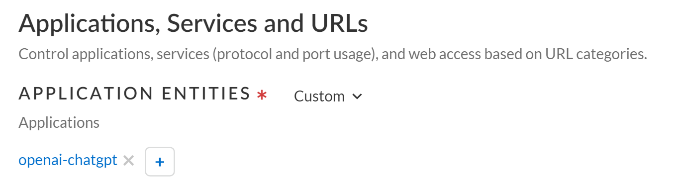 Create a Security policy and attach the Profile Group.Alternatively, you can create or add ChatGPT to an Internet Access policy rule. You can skip this step if you create a Internet Access policy rule for ChatGPT.- Select ConfigurationSecurity ServicesSecurity Policy and Add Rule.You can also update an existing Security policy to attach a Profile Group for Enterprise DLP filtering.In the Applications, Services, and URLs section, Add Applications to search for and select openai-chatgpt.