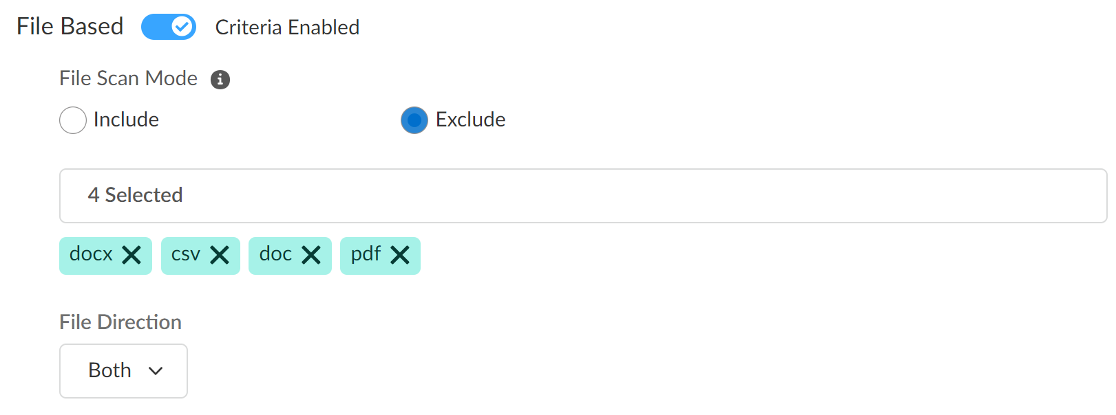 - (Prisma Access 5.1 and later) Select the File Scan Mode to explicitly include or exclude specific file types.A DLP rule supports only one type of file mode. You can't configure a DLP rule to both include and exclude specific file types.