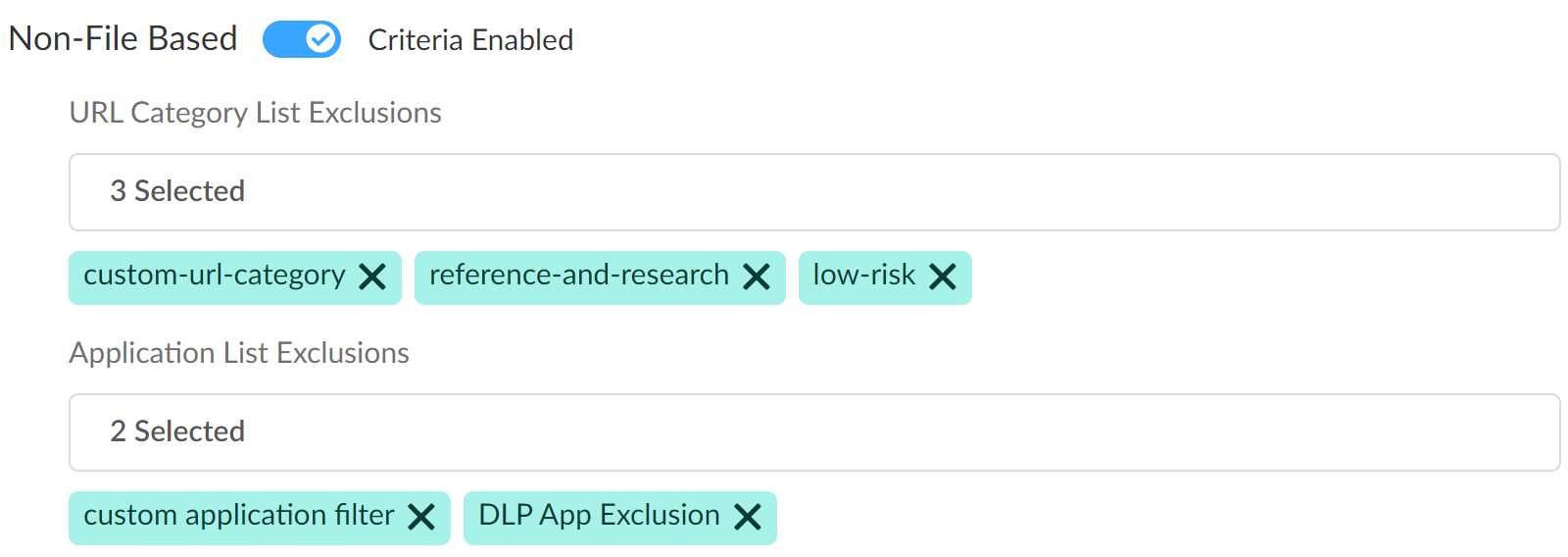 - (Required for Non-File Based Match Criteria) Application List Exclusion—Exclude forwarding traffic from one or more specific apps to Enterprise DLP.Enterprise DLP requires at least one Application Filter if you enable exclusions for non-file based traffic inspection. Palo Alto Networks recommends adding the predefined DLP App Exclusion application filter if you don't have a custom or predefined application filter you want to add. Alternatively, you can create a custom application filter in the Global Configuration Scope. You can select multiple application filters to exclude app traffic from non-file inspection.
