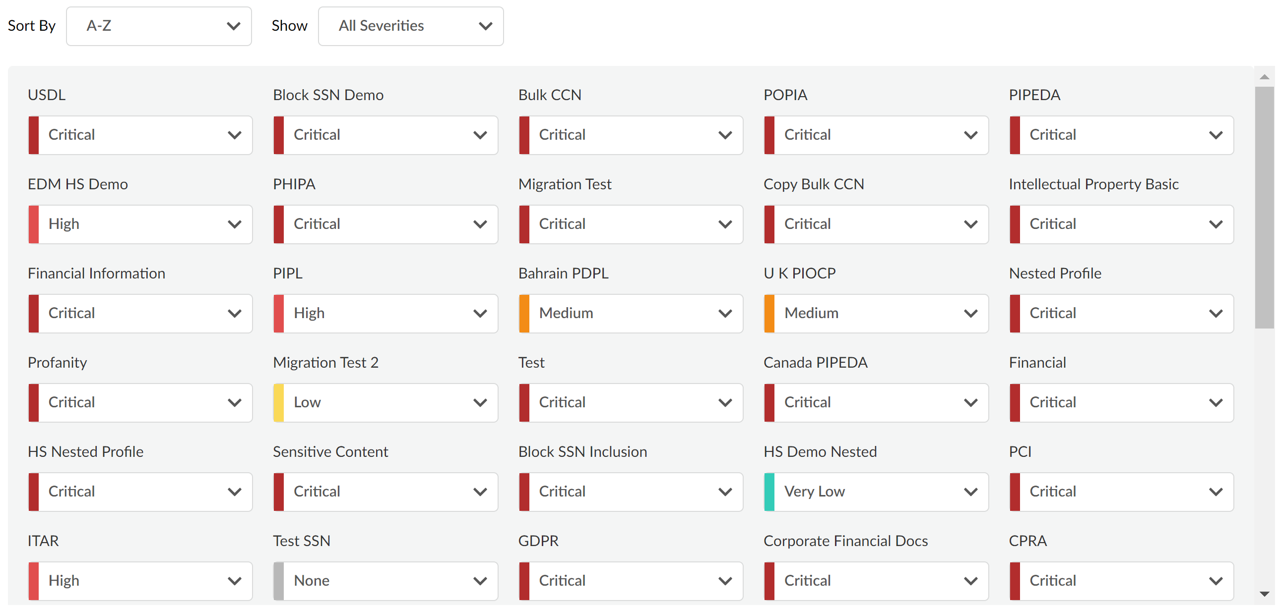 Configure the severity for each data profile. Setting higher severity increases the effect a match of a particular Data Profile has on the data risk for a data asset. If an asset matches multiple data profiles, it will be assigned the highest matching severity for the Data Profile risk factor. The data profiles listed here included all Enterprise Data Loss Prevention (E-DLP) predefined and custom data profiles. All custom data profiles are assigned a default severity. You can apply the following severity levels:
