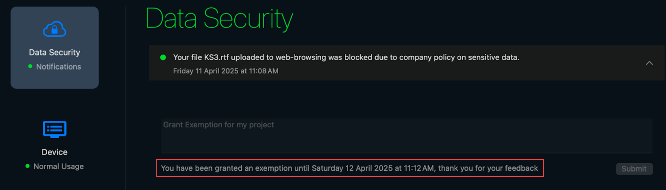 Return to the Access Experience User Interface to review your exemption request status. The data security incident status turns to green after your data security administrator grants or denies your exemption request.If your data security administrator granted the exemption request, the exemption expiration timestamp (date and time) displays for the data security incident. You can now reattempt the activity that generated the DLP incident that was granted an exemption.