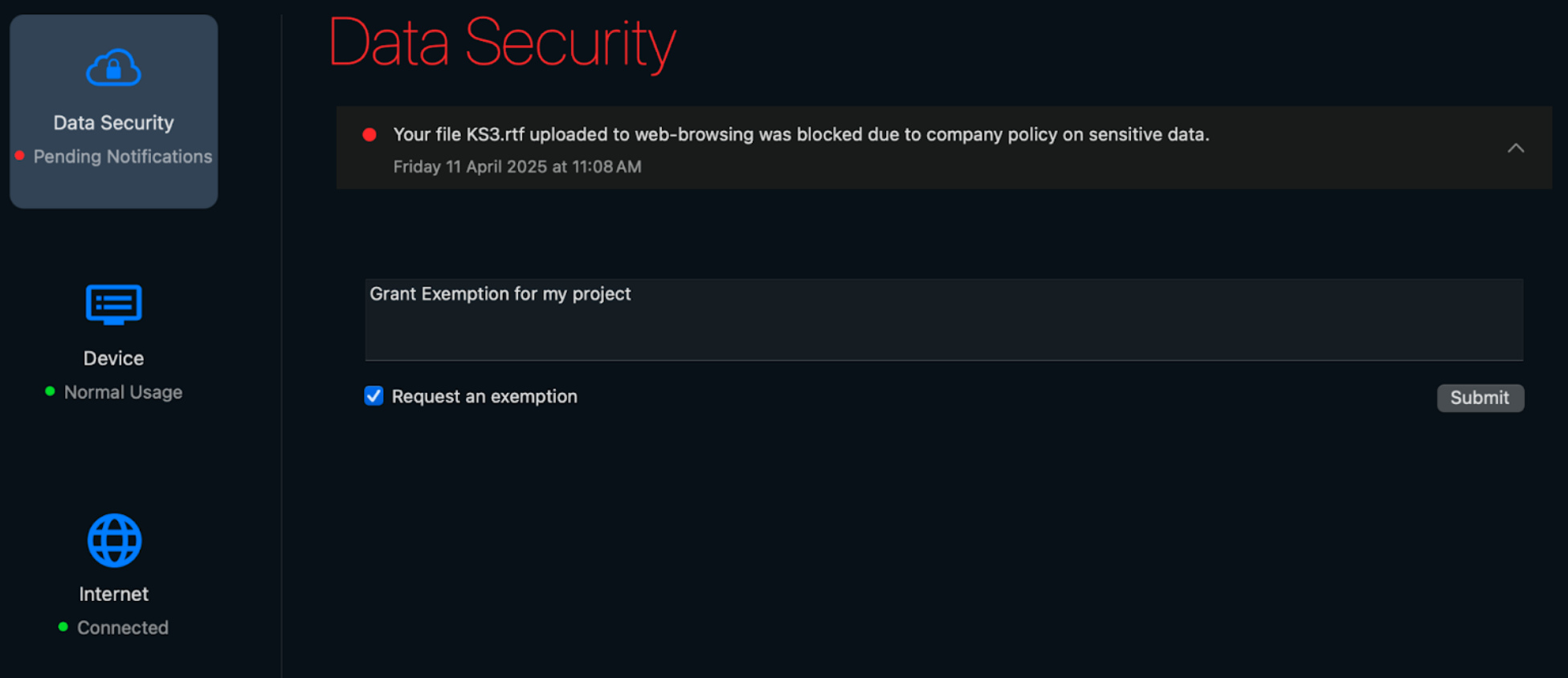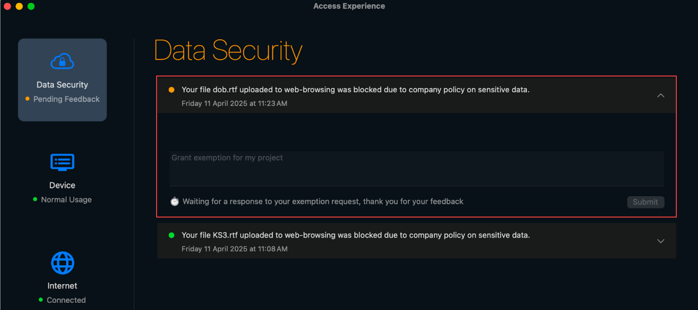 - On the endpoint, open Access Experience User Interface.Navigate to the Data Security notification you want to submit an exemption for.A Data Security notification with a red incident status means the notification is pending and requires the end user's review. The incident status remains red until the end user submits an exemption request or feedback.Check (enable) Request an exemption and enter the business justification or reason for why your data security administrator should grant the exemption.The request to provide feedback depends on how your data security administrator configured the End User Coaching notification template. For auditing purposes, Palo Alto Networks recommends end users provide a business justification or reason for all exemption requests.Submit the exemption request.