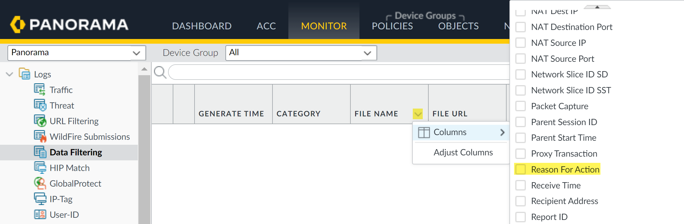 - Panorama® management server—View the Data Filtering log (MonitorLogsData Filtering).Apply a (subtype eq dlp) filter to narrow down the list of data filtering logs.If the Reason for Action column isn’t displayed, expand the menu for any displayed column and click Columns and check (enable) Reason for Action.