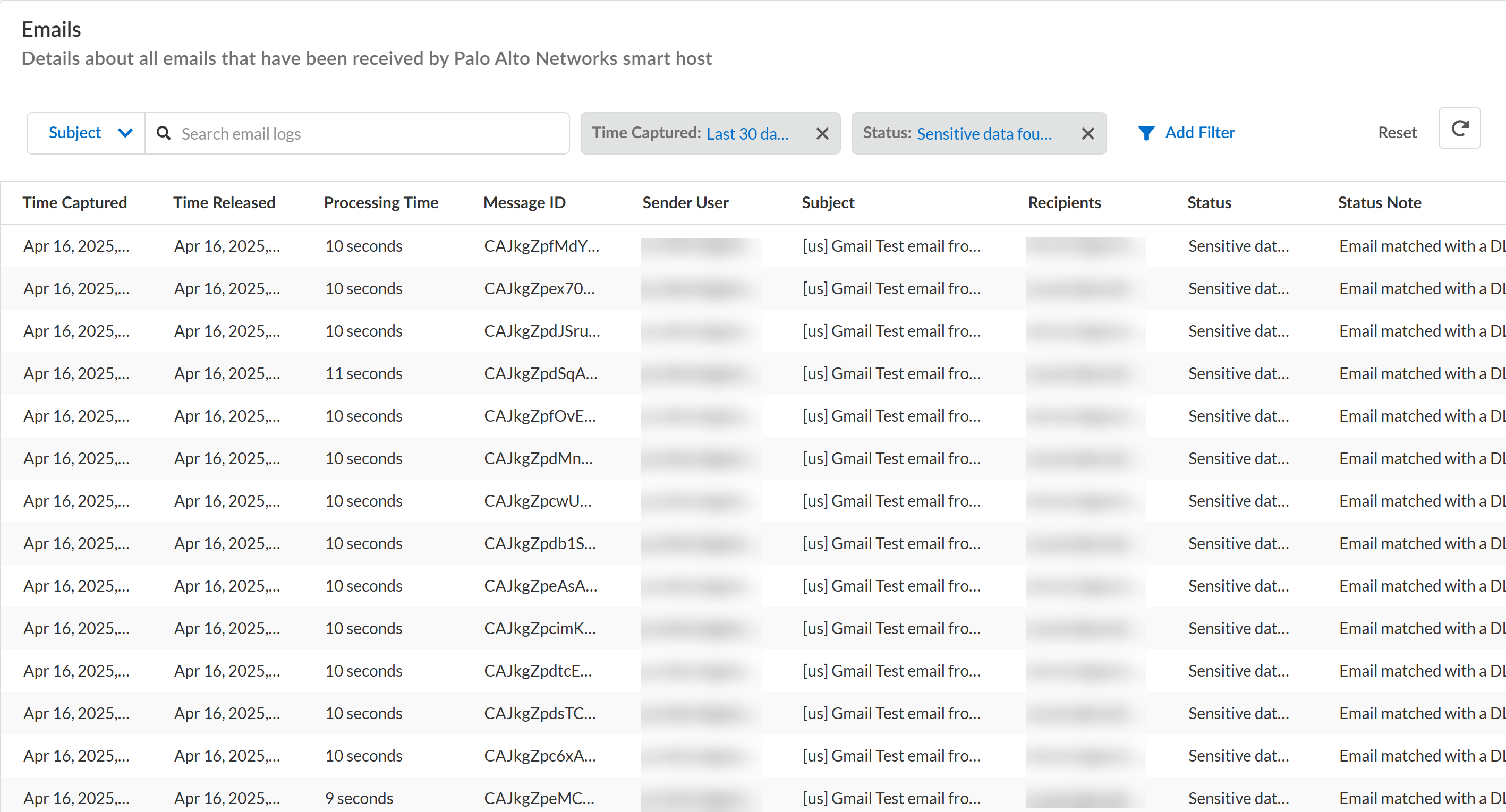 - You can search for specific Email DLP logs based on the email Subject, Message ID, Sender email, or Recipient email.