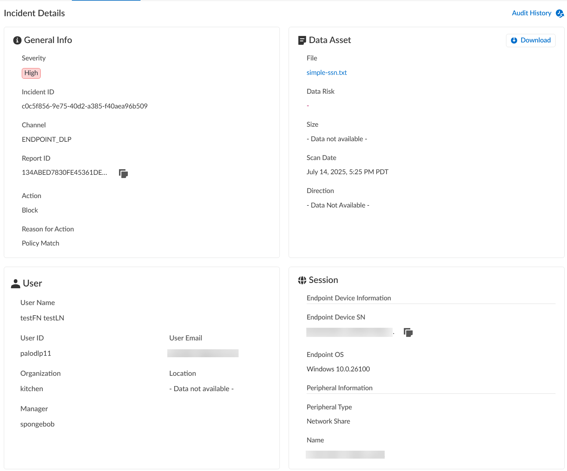 - Severity—The incident severity configured in the Endpoint DLP policy rule.