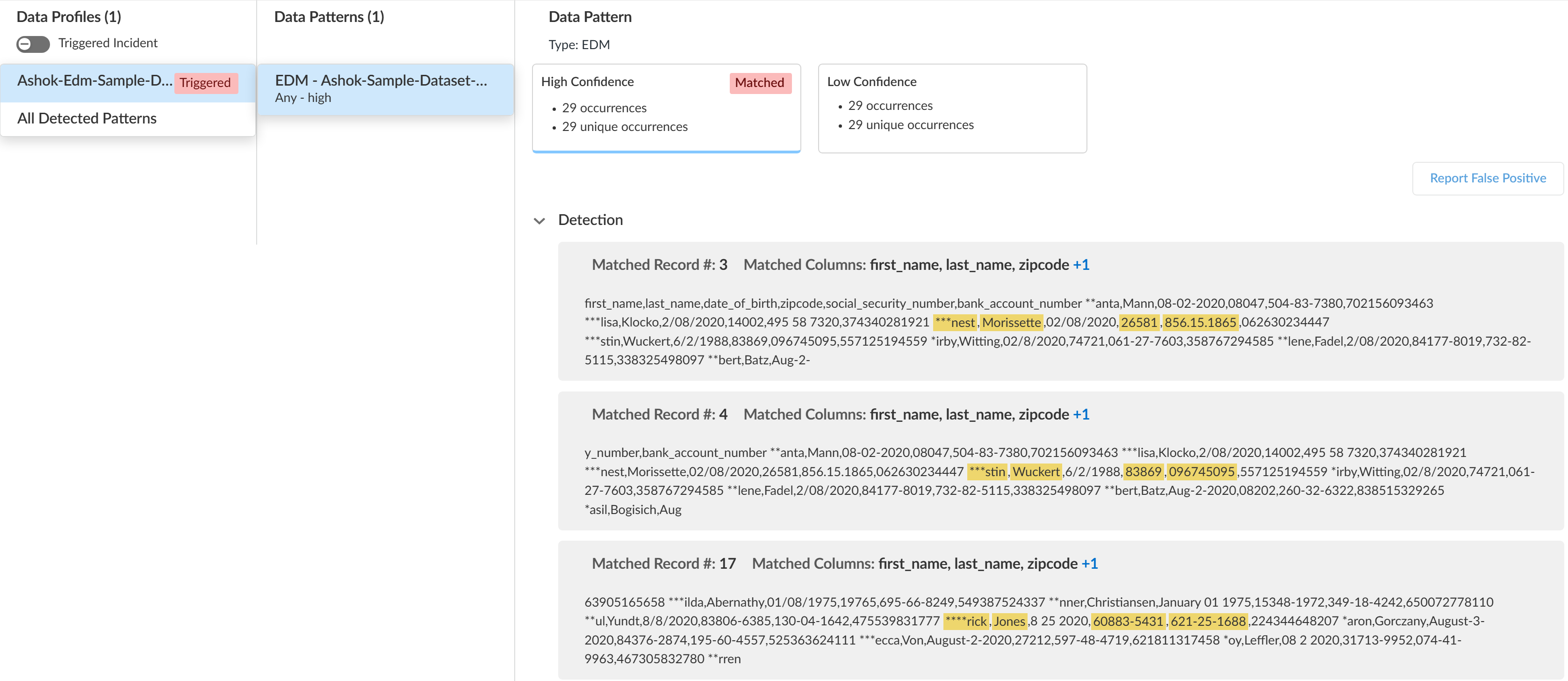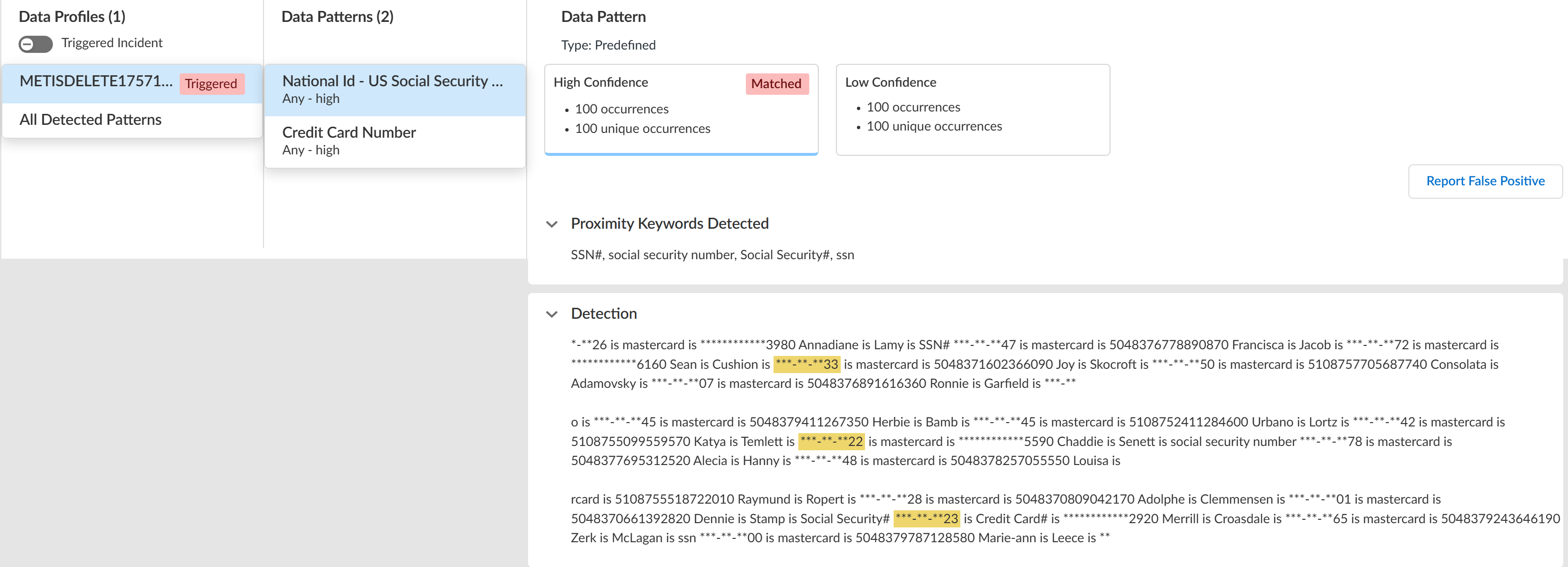 Review the Matches within Data Profiles to review snippets of matching traffic and the data patterns that matched the traffic to better understand what sensitive data Enterprise DLP detected.Toggle the Triggered Incidents to display only the data patterns that contain matched criteria.- Enterprise DLP generates an audit log when a user accesses a DLP incident and reviews the associated snippet.