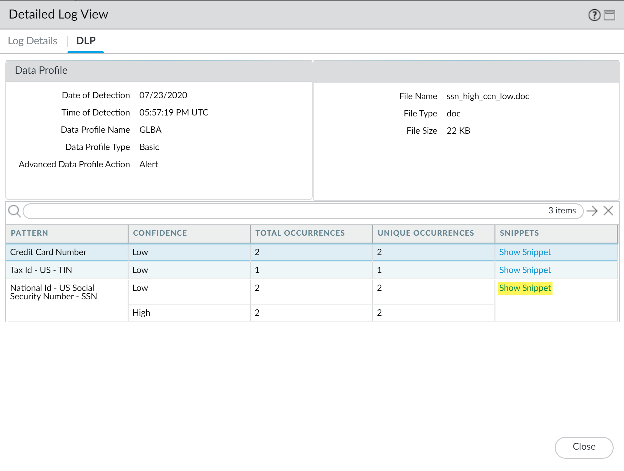 Select DLP to view the pattern details.Show Snippet to view a snippet of the data that matched the specific data pattern.For nested data profiles, Enterprise DLP displays the name of the nested data profile and not the specific data profile containing the match criteria that matched inspected traffic. For example, you create a nested data profile called DataProfile and you add Profile1, Profile2, and Profile3. Enterprise DLP inspects traffic that matches Profile2 and blocks it. In this scenario, the Data Profile Name in the DLP incident logs displays DataProfile.