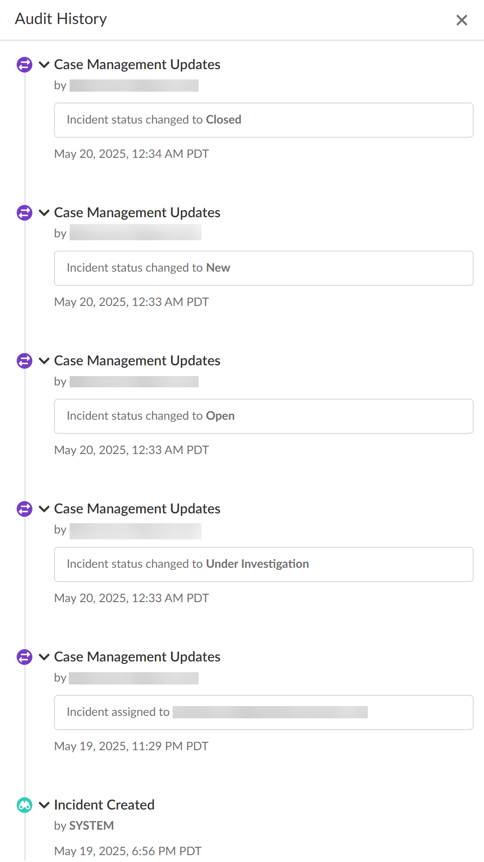 - Audit HistoryThe Audit History shows you the full Incident Case Management history for the specific DLP incident. It outlines every step of the case management process and the specific action taken by each user from when the incident case was assigned to when it was closed.