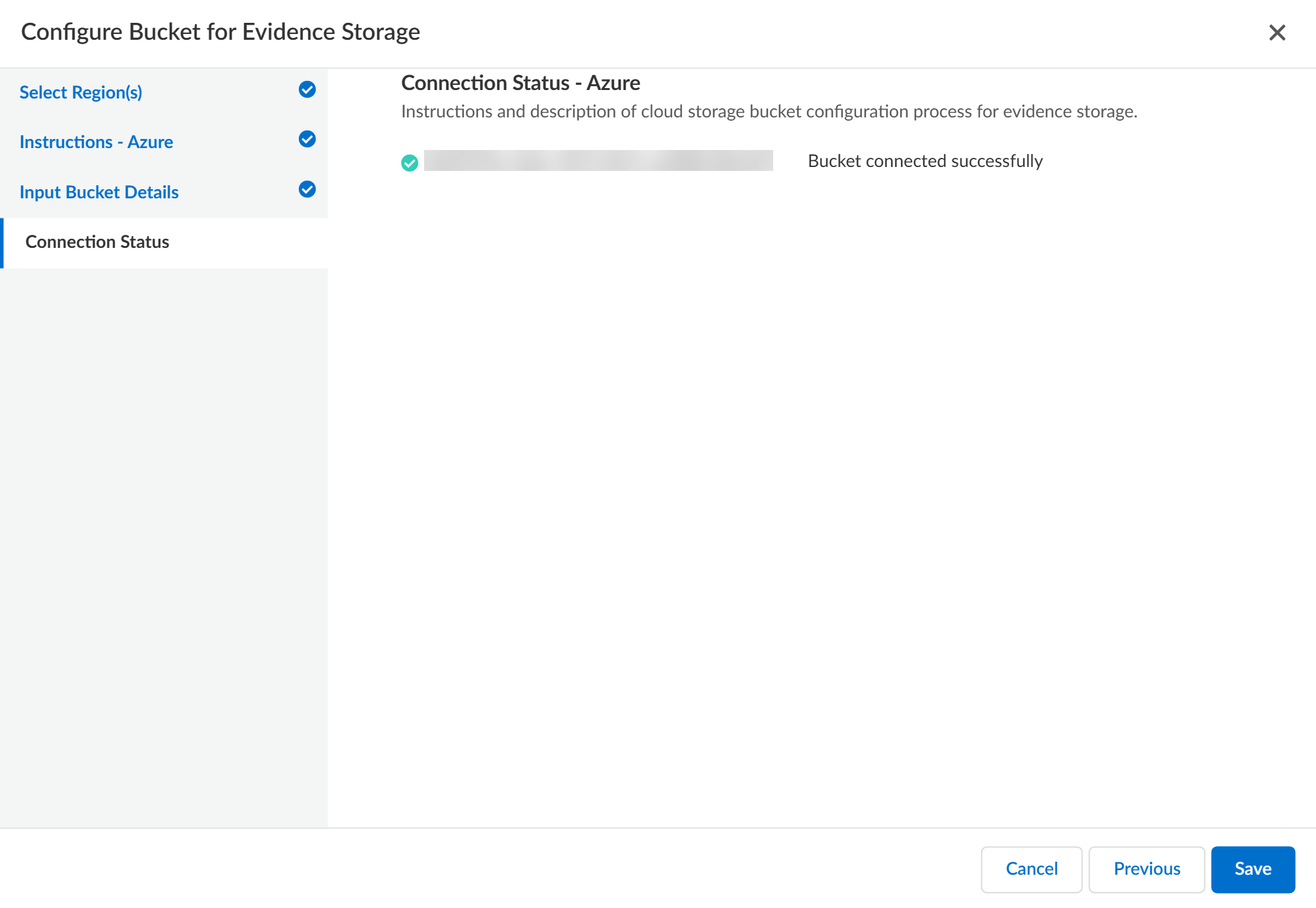Review the Connection Status to verify Enterprise DLP successfully connected to your storage bucket.As part of the setup process, Enterprise DLP uploads a Palo_Alto_Networks_DLP_Connection_Test.txt file to your storage bucket to test and verify connectivity.Save the storage bucket settings if Enterprise DLP successfully connected.Select Previous and edit the bucket connection settings if Enterprise DLP can’t successfully connect to your storage bucket.