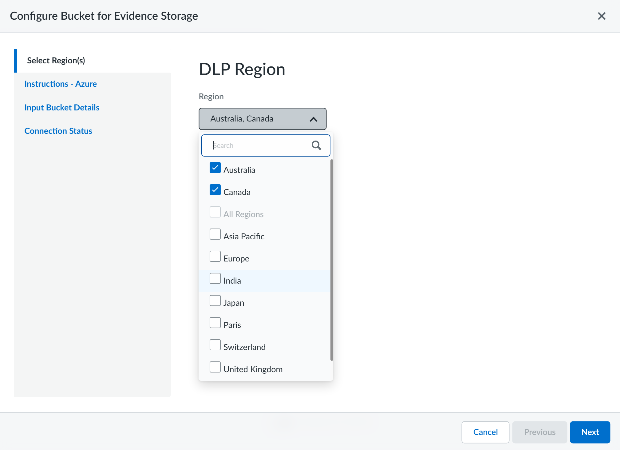 From the portal menu, select Storage accounts and select the storage account you want to use to save files for evidence analysis.Select Access Control (IAM)AddAdd Role AssignmentStorage Blob Data Owner and click Next.Select to assign access to User, group, or service principle and select members.Search and select the Palo Alto Networks Enterprise DLP application and Select the application.Review + assign to allow Enterprise DLP to write to the storage account.It can take up to 10 minutes for the write permissions to be successfully granted to Enterprise DLP.Log in to Strata Cloud Manager.Access to evidence storage settings and files on Strata Cloud Manager is allowed only for an account administrator or app administrator role with Enterprise DLP read and write privileges. This ensures that only the appropriate users have access to report data and evidence.(Email DLP only) Select ConfigurationSaaS SecuritySettingsEmail DLP Settings and enable Evidence Storage for Email DLP.You must enable the evidence storage service for Email DLP so Enterprise DLP can forward evidence files to your storage buckets. Enterprise DLP won't forward evidence files for Email DLP traffic matches if you don't enable this setting.Configure the storage bucket for evidence file storage.- Select ConfigurationData Loss PreventionSettingsSensitive Data and select Configure Regional BucketAzure.Select the Region(s) from which you want to forward evidence files to the storage bucket.This setting specifies the regions where DLP incidents are generated. When DLP incidents are generated in the regions you select here, Enterprise DLP forwards the incident evidence to the storage bucket.