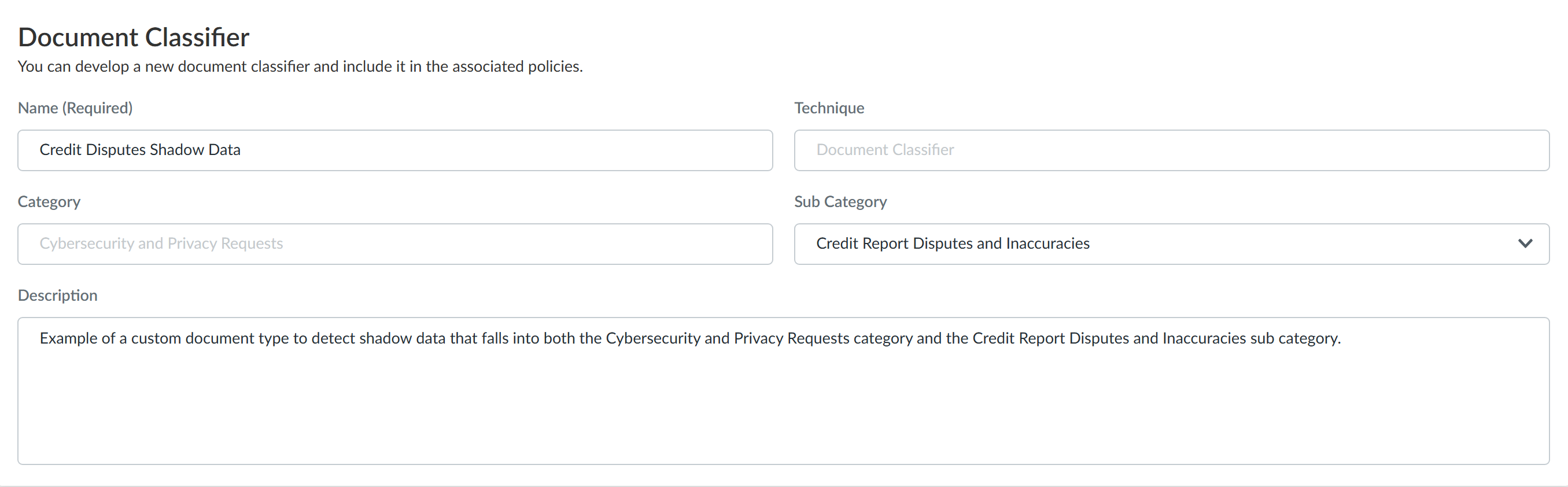 Review the discovered files.Apply filters to narrow down and understand the types of shadow data discovered by Enterprise DLP in the specific category. Applying filters does not narrow down shadow data Enterprise DLP takes action on in the next step. Enterprise DLP takes the action you configure in the next step for all shadow data in the selected category regardless of filters applied.Click Next: Actions to configure the actions Enterprise DLP takes to secure this sensitive data from exfiltration.Configure the actions Enterprise DLP takes discovered shadow data.Enterprise DLP creates an Indexed Document Matching (IDM) custom document type to prevent exfiltration of sensitive data that matches the selected Category and Sub Category if selected.In the example displayed below, the selected Category is Cybersecurity and Privacy Requests and the Sub Category is Credit Report Disputes and Innaccuracies. In this case, Enterprise DLP takes action on any shadow data that matches both these categories when you add the custom document type to a data asset policy rule.- Enter a Name for the new custom document type.(Optional) Enter a Description.The Category field displays the shadow data category you want to take remediation action for. You can't edit this field.(Optional) Select a Sub Category. You can only select one sub category.Click Next: Summary.