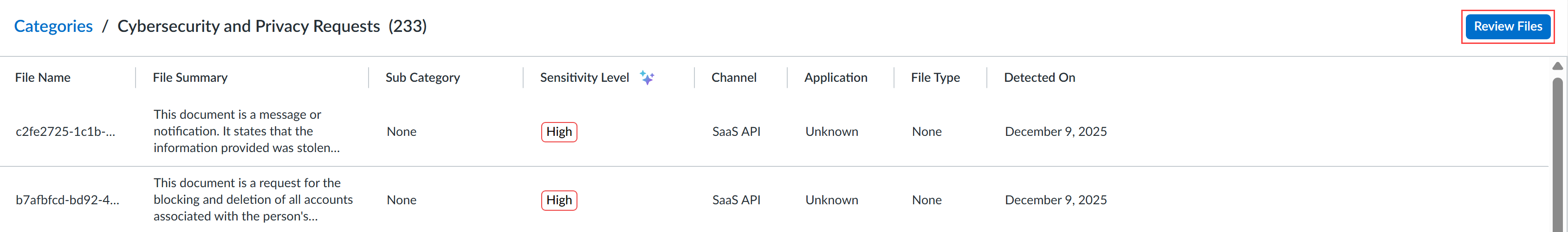 If you selected a category from the Top Clusters, the Categories lists all the shadow data discovered by Enterprise DLP. Click Review Files at the top of the Categories list.