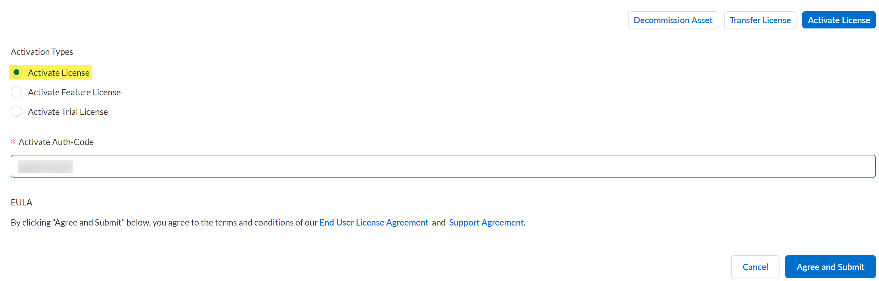 Click Activate License at the bottom of the page.Select Activate License from the list of Activation Types.In the Activate Auth-Code field, enter the auth code provided by Palo Alto Networks.Agree and Submit.