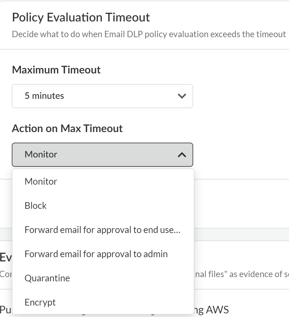 - Maximum Timeout—Maximum time allowed for Enterprise DLP to inspect an outbound email. Minimum timeout is 1 minute. Maximum timeout is 5 minutes.