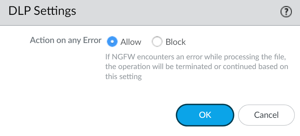 Specify the Action on any Error the NGFW or Prisma Access tenant takes when any kind of error occurs that prevents Enterprise DLP from inspecting forwarded file or non-file traffic and rendering a verdict.This includes when the NGFW or Prisma Access tenant encounter file or non-file traffic smaller than the configured Min Data Size (B) (non-file), and the Action on Max File Size (file) and Max Data Size (KB) (non-file).- Select Allow (default) to continue if the NGFW or Prisma Access tenant experiences any type of error.