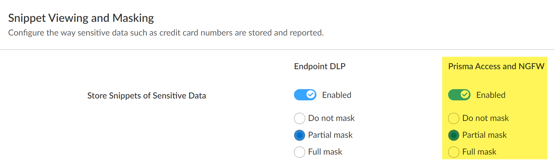 - Log in to Strata Cloud Manager.Select ConfigurationData Loss PreventionSettingsSensitive Data.Enable Snippets Viewing and Masking for Prisma Access and NGFW to store the snippets of sensitive data that match your Enterprise DLP data patterns.Configure how to Snippets Masking for storage in the DLP cloud service.
