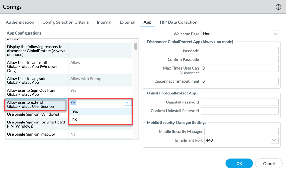 To configure Extend User Session for GlobalProtect users: - Select NetworkGlobalProtectPortals.Select the portal configuration to which you're adding the agent configuration, and then select the Agent tab.On the Agent tab, select AppApp.In the App Configurations area, set Allow User to Extend GlobalProtect User Session to Yes to allow users to extend the login lifetime session of the GlobalProtect app before it expires to prevent abrupt app session logout. Select No (default) if you don't want users to be able to extend the login lifetime session of the GlobalProtect app before it expires.