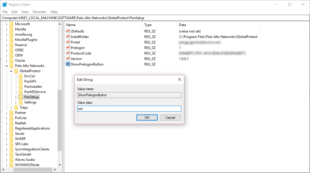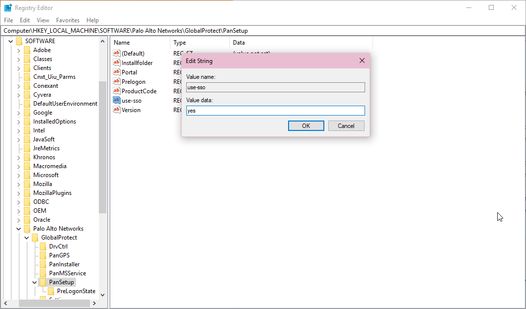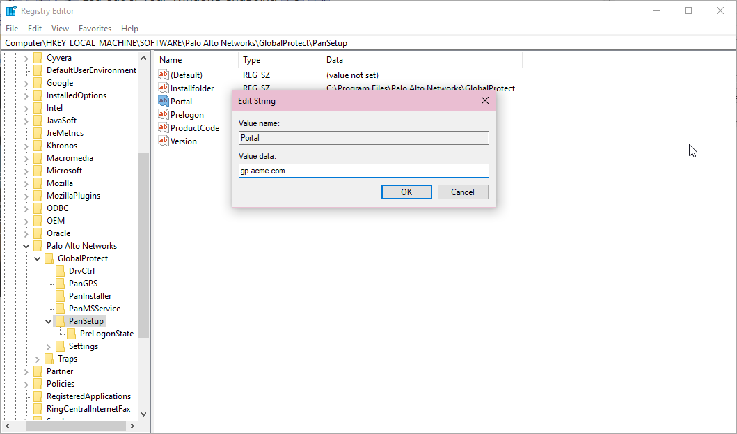 - In the Windows Registry, go to: HKEY_LOCAL_MACHINE\SOFTWARE\Palo Alto Networks\GlobalProtect\PanSetup\.