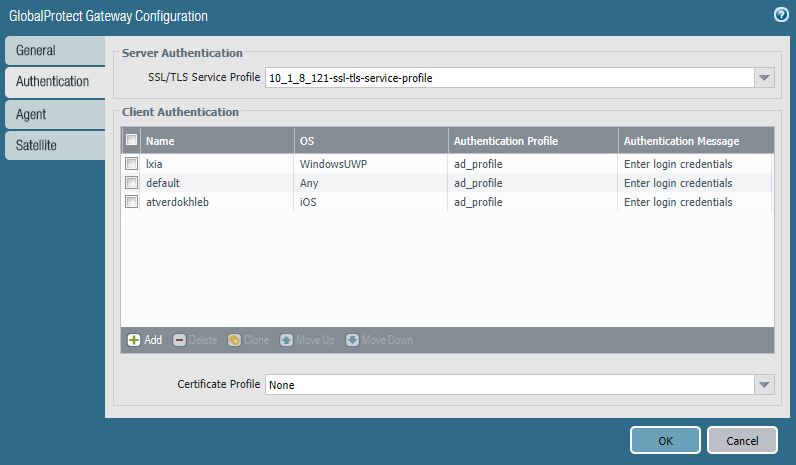 Select an existing SSL/TLS Service Profile for securing the gateway, or Add a new service profile (NetworkGlobalProtectGateways<gateway-config>Authentication).Add a Client Authentication configuration (NetworkGlobalProtectGateways<gateway-config>Authentication), and then configure the following settings:- Name—Name of the client authentication configuration.