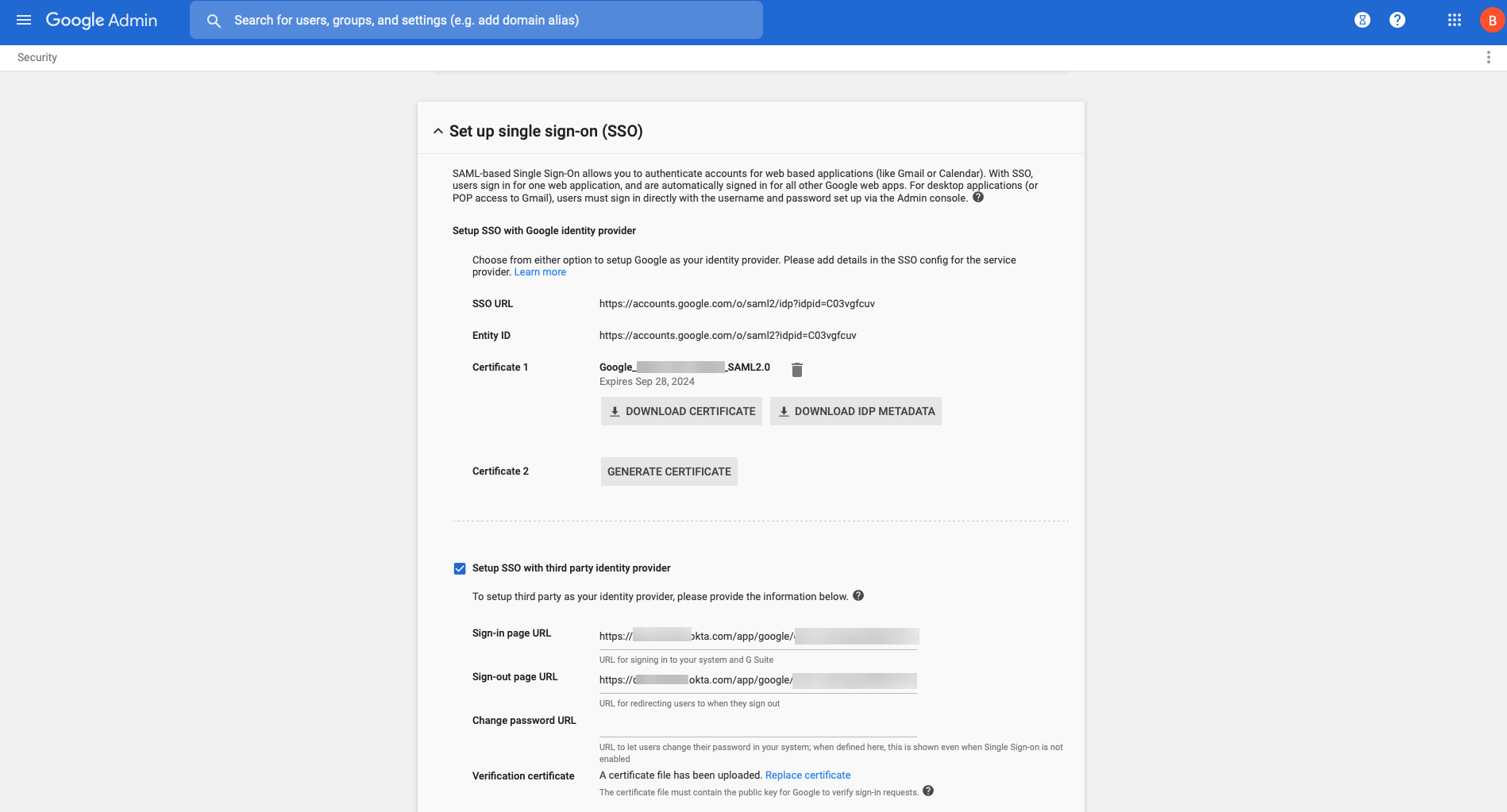 Select Set up single sign-on (SSO).( Optional) If you want to set up SSO with any other provider besides Google, select Setup SSO with third party identity provider and specify the Sign-in page URL and Sign-out page URL and upload a valid Verification certificate.
