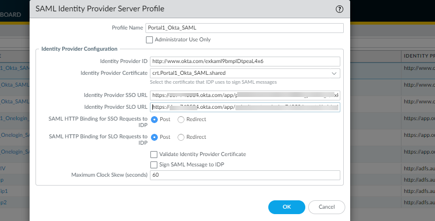 - Export the SAML metadata file from the IdP to an endpoint that the firewall can access.Refer to your IdP documentation for instructions on how to export the file.Select DeviceServer ProfilesSAML Identity Provider.Import the metadata file onto the firewall.Enter a Profile Name to identify the server profile, such as GP-User-Auth.Browse for the metadata file.Select Validate Identity Provider Certificate (default) so that the firewall validates the IdP certificate.Validation occurs only after you assign the server profile to an authentication profile and Commit the changes. The firewall uses the certificate profile within the authentication profile to validate the certificate.Enter the Maximum Clock Skew, which is the allowed system time difference (in seconds) between the IdP and the firewall when the firewall validates IdP messages. The default value is 60 seconds, and the range is 1-900 seconds. If the difference exceeds this value, authentication fails.Click OK to save the server profile.(Optional) Create an authentication profile.The authentication profile specifies the server profile that the portal or gateways use when they authenticate users. On a portal or gateway, you can assign one or more authentication profiles to one or more client authentication profiles. For more information on how an authentication profile within a client authentication profile supports granular user authentication, see Configure a GlobalProtect Gateway and Set Up Access to the GlobalProtect Portal.SAML authentication supports Remote Access VPN with Pre-Logon with GlobalProtect app 5.0 and later releases.