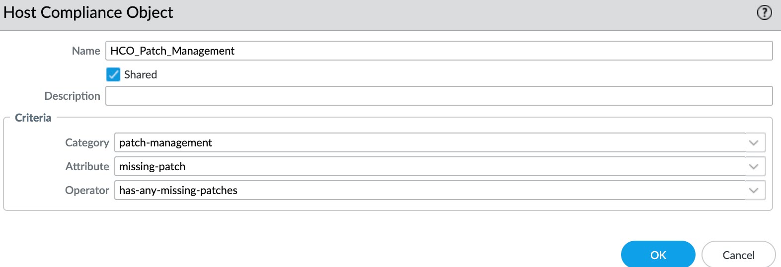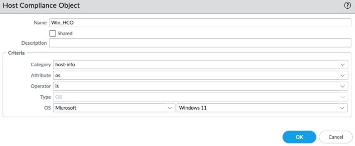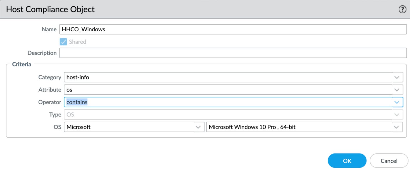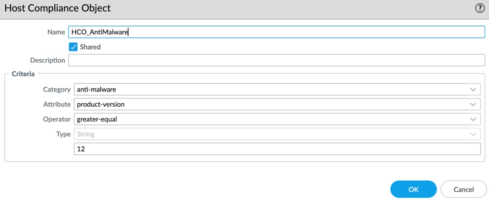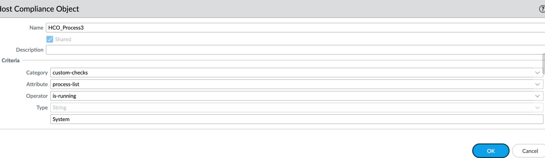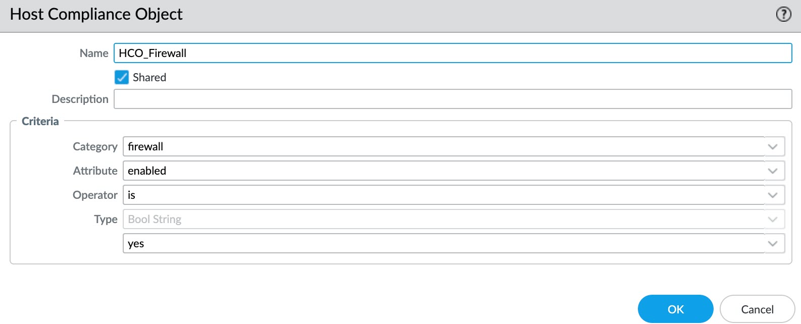 - On the firewall(s) hosting GlobalProtect gateway(s), select ObjectsHost Compliance Objects and then Add a new HCO.Enter a Name and Description for the object.Define the specific host criteria you want to check by selecting:
