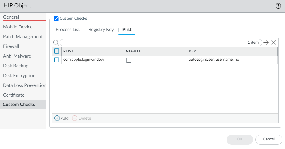 Click OK to save the HIP object. You can Commit the changes to view the data in the HIP Match logs at the next device check-in or continue to step 6.For macOS endpoints only:- To check macOS endpoints for a specific plist, select Plist, and then Add the plist for which you to want to check. When prompted, enter the name of the Plist. If you want to match macOS endpoints that do not have the specified plist, enable the Plist does not exist option.To match on a specific key-value pair within a plist, select Plist, and then Add the plist for which you to want to check. When prompted, enter the name of the Plist and then Add a Key and corresponding Value to match. Alternatively, if you want to identify endpoints that do not have a specific key and value, you can select Negate after you add the Key and Value.