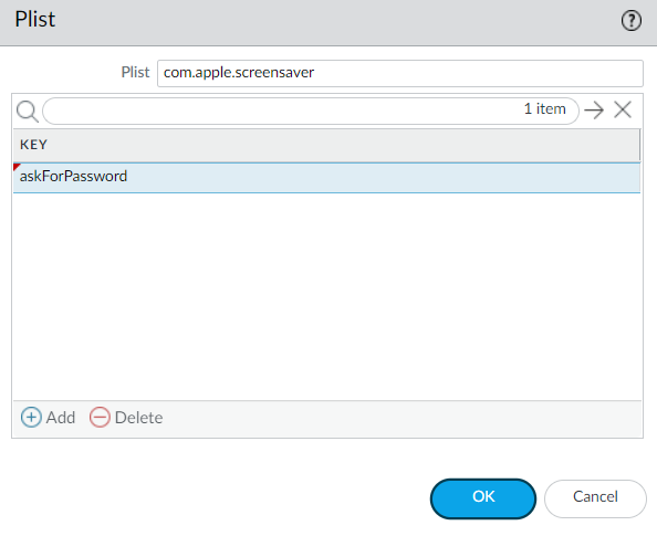 For example, Add the Plist com.apple.screensaver and the Key askForPassword to collect information on whether a password is required to wake the macOS endpoint after the screen saver begins: