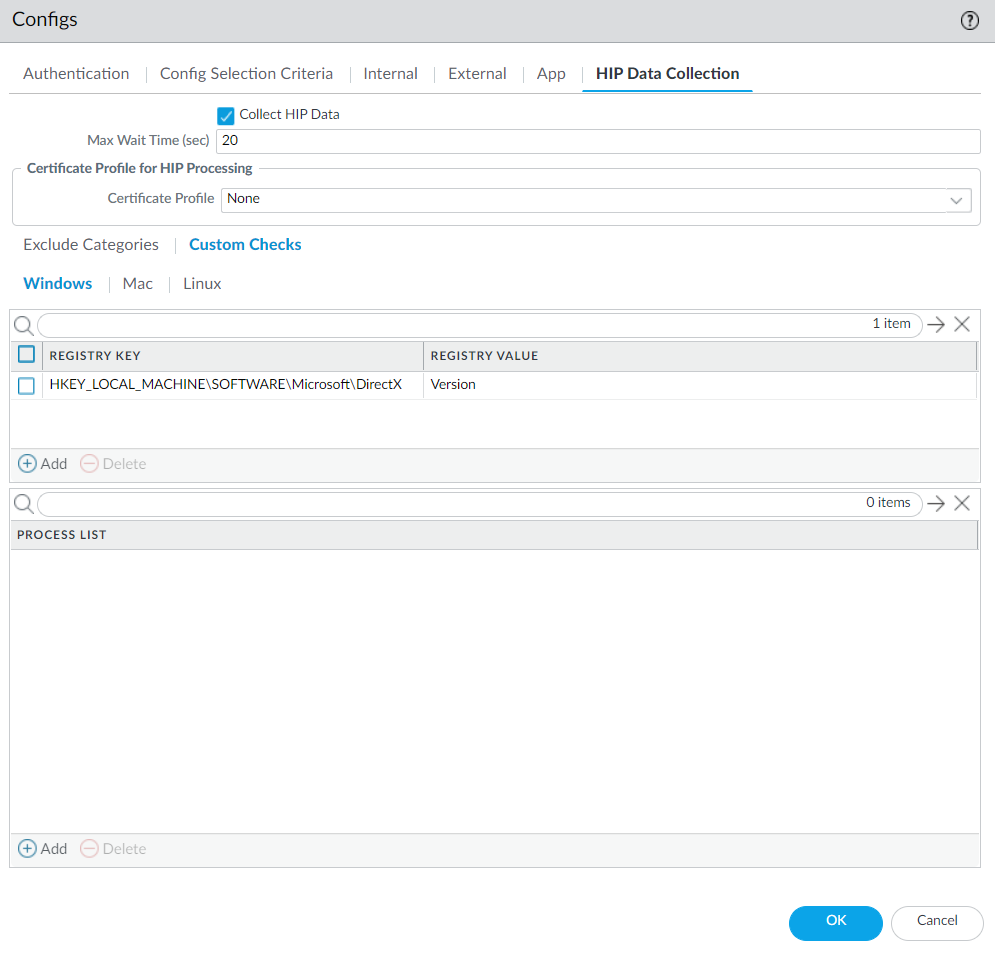 (Optional) Check if a specific process is running on the endpoint.- Select NetworkGlobalProtectPortals.Select an existing portal configuration or Add a new one.On the Agent tab, select the agent configuration that you want to modify or Add a new one.Select HIP Data Collection.Enable the GlobalProtect app to Collect HIP DataSelect Custom ChecksWindows, Mac, or Linux.Add the name of the process that you want to collect information about to the Process List.Save the custom check.Click OK and Commit the changes.(Optional) Create a HIP Object to match to a Registry Key (Windows), plist (macOS), or process list (Linux), which allows you to filter the raw host information collected from the GlobalProtect app to monitor the data for the custom check.With a HIP object defined for the custom check data, the gateway matches the raw data submitted from the app to the HIP object, and a HIP Match log entry is generated for the data (MonitorHIP Match).For Windows, macOS, and Linux endpoints: