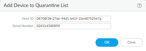 - To manually add a device to the quarantine list from the Device Quarantine page, select DeviceDevice Quarantine or PanoramaDevice Quarantine and Add the device.Add the Host ID and, optionally, the Serial Number of the device. GlobalProtect uses the Host ID to identify the device.