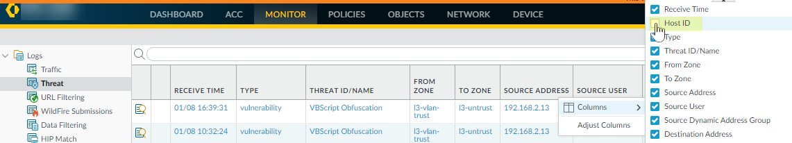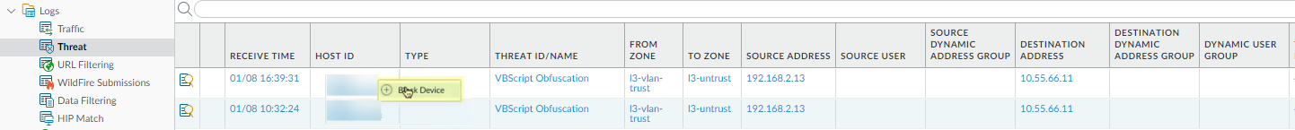To add a device to the quarantine list from the GlobalProtect, Threat, Traffic, or Unified logs, complete the following steps.- (Threat, Traffic, and Unified Logs Only) To add Host ID information to the Traffic, Threat, and Unified logs, select PoliciesSecurity and Add a security policy rule; then, select Quarantine as the Source Device for Source traffic.A Host ID is required to add a device to the quarantine list. When a user connects to the network with the GlobalProtect app, GlobalProtect automatically adds Host ID information for the connected endpoint to the GlobalProtect log. The host ID value varies by endpoint type: