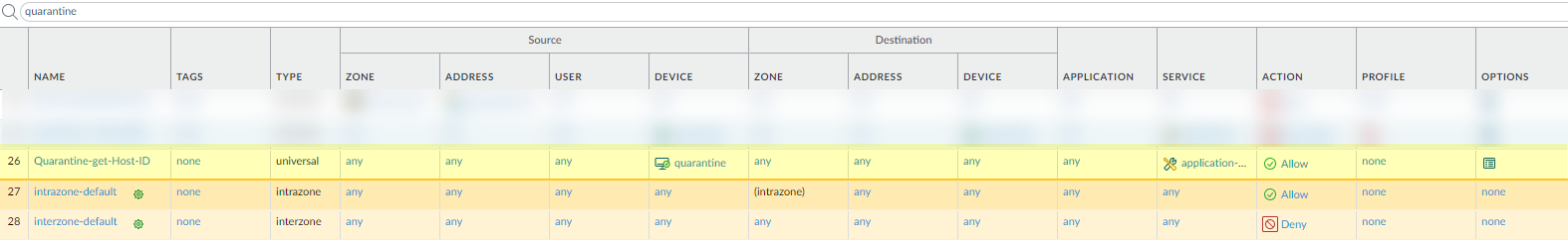 To make sure that you are adding the Host ID for all devices you want to quarantine (either manually or automatically), create a security policy that allows all traffic and specify Quarantine as the Source Device. It does not matter what order you place this policy in the list of policies for it to work.