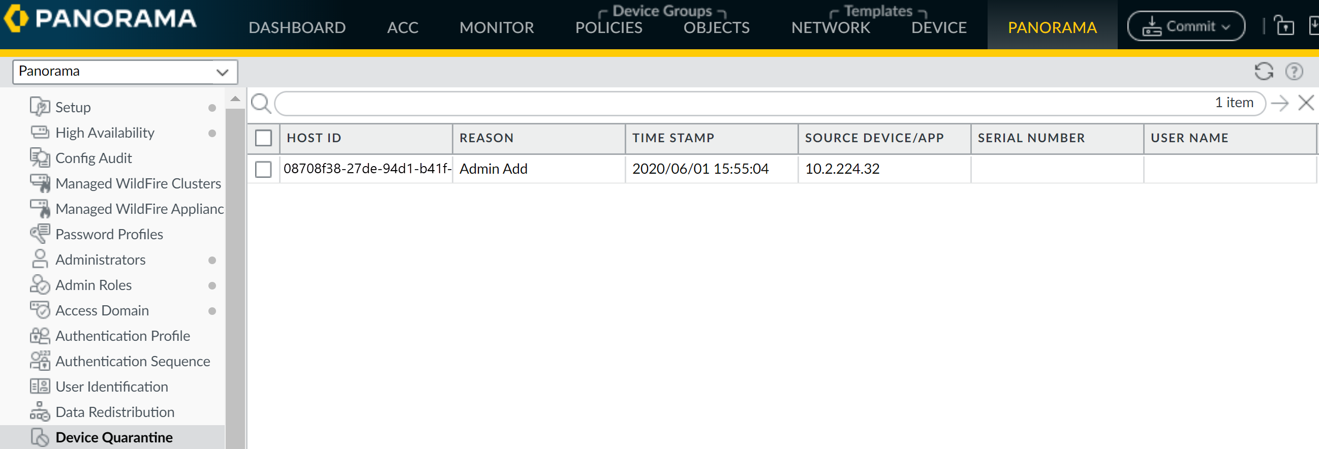 For Panorama appliances, view the DeviceDevice Quarantine by selecting PanoramaDevice Quarantine.