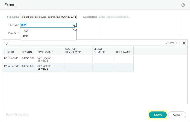 file, select PDF/CSV at the bottom of the Device Quarantine page