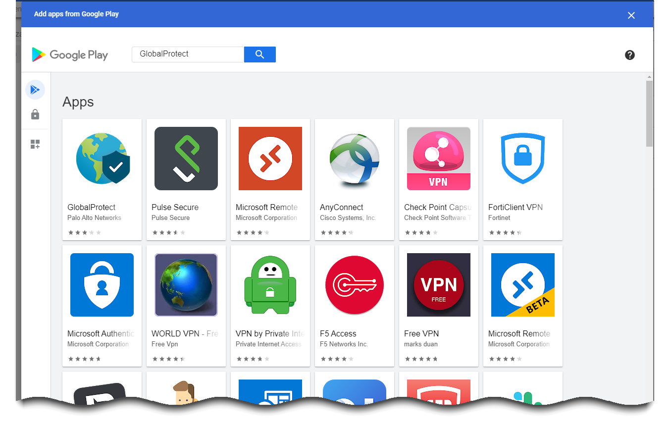 When the Google Play store launches, search for GlobalProtect and then click the GlobalProtect app icon.