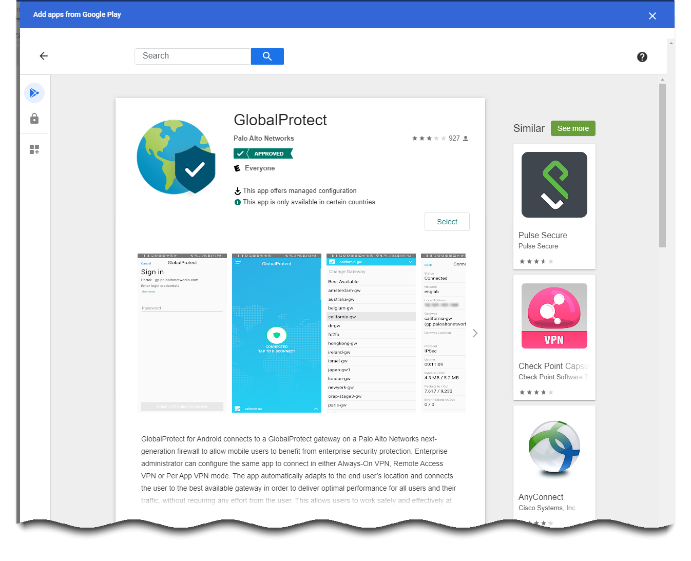 Click Select to add the GlobalProtect app.A message appears if the GlobalProtect app is successfully added as a result.