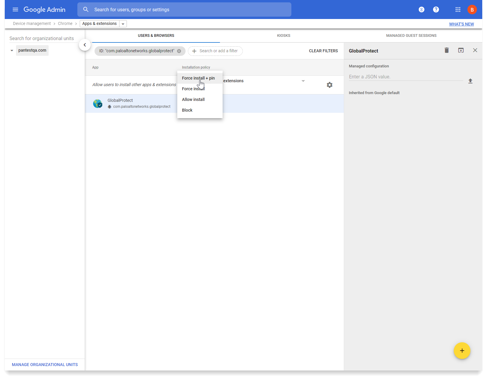 Determine how the GlobalProtect app is installed on Chromebooks.After you approve the GlobalProtect app, you must specify how the app is installed on Chromebooks. To prevent users from bypassing GlobalProtect by uninstalling the app, force all Chromebooks to install the GlobalProtect app automatically when users log in to their Chromebook.- From the app extension management settings (Device managementChrome Apps & extensions), select GlobalProtect from the Apps list.Select your organizational unit from the list on the left edge of the page.Select any of the following options: