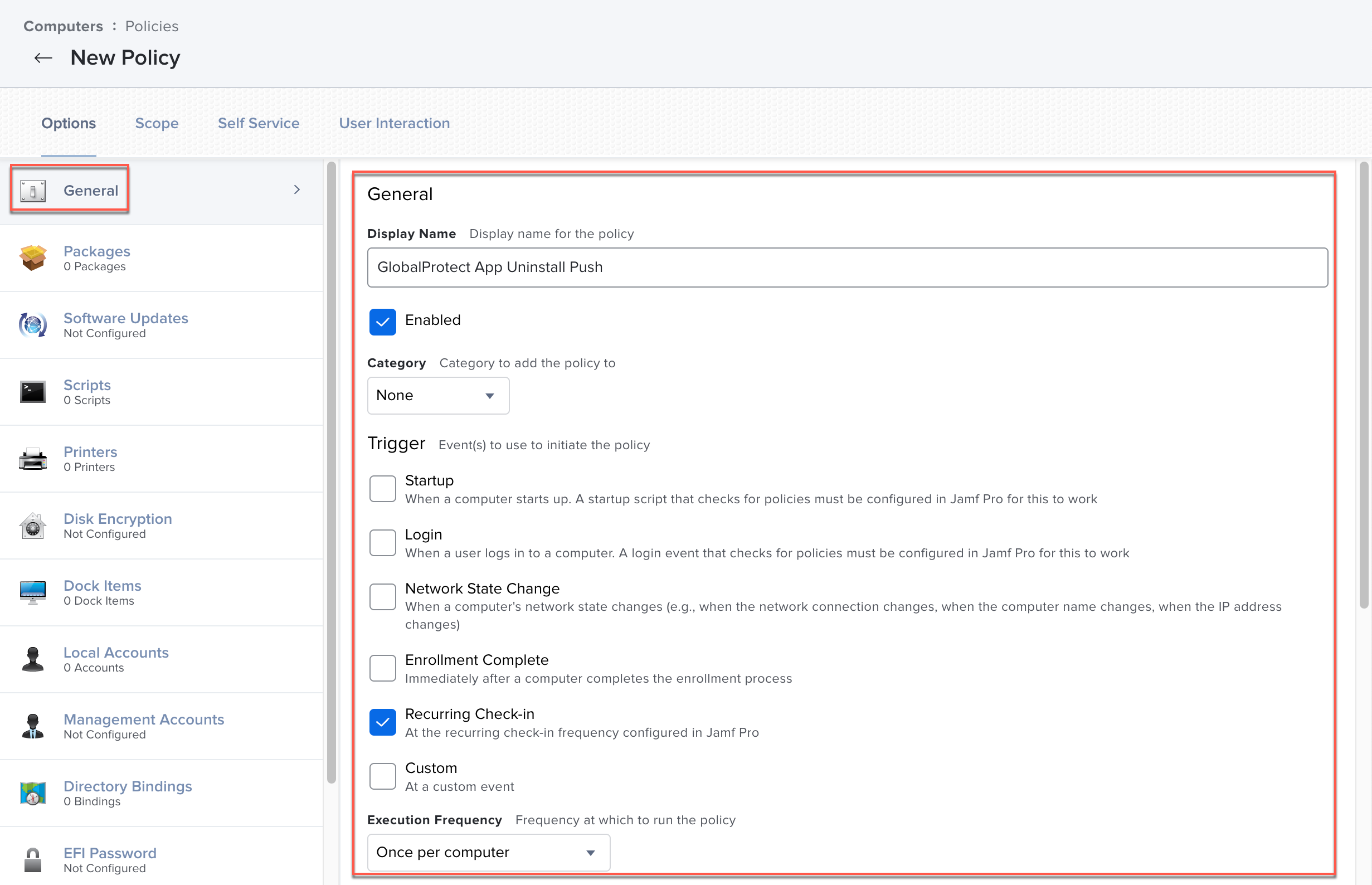 Save the policy.The next time macOS endpoints check in with Jamf Pro and meet the trigger in the General payload, the policy will run and uninstall the GlobalProtect app from the endpoints.