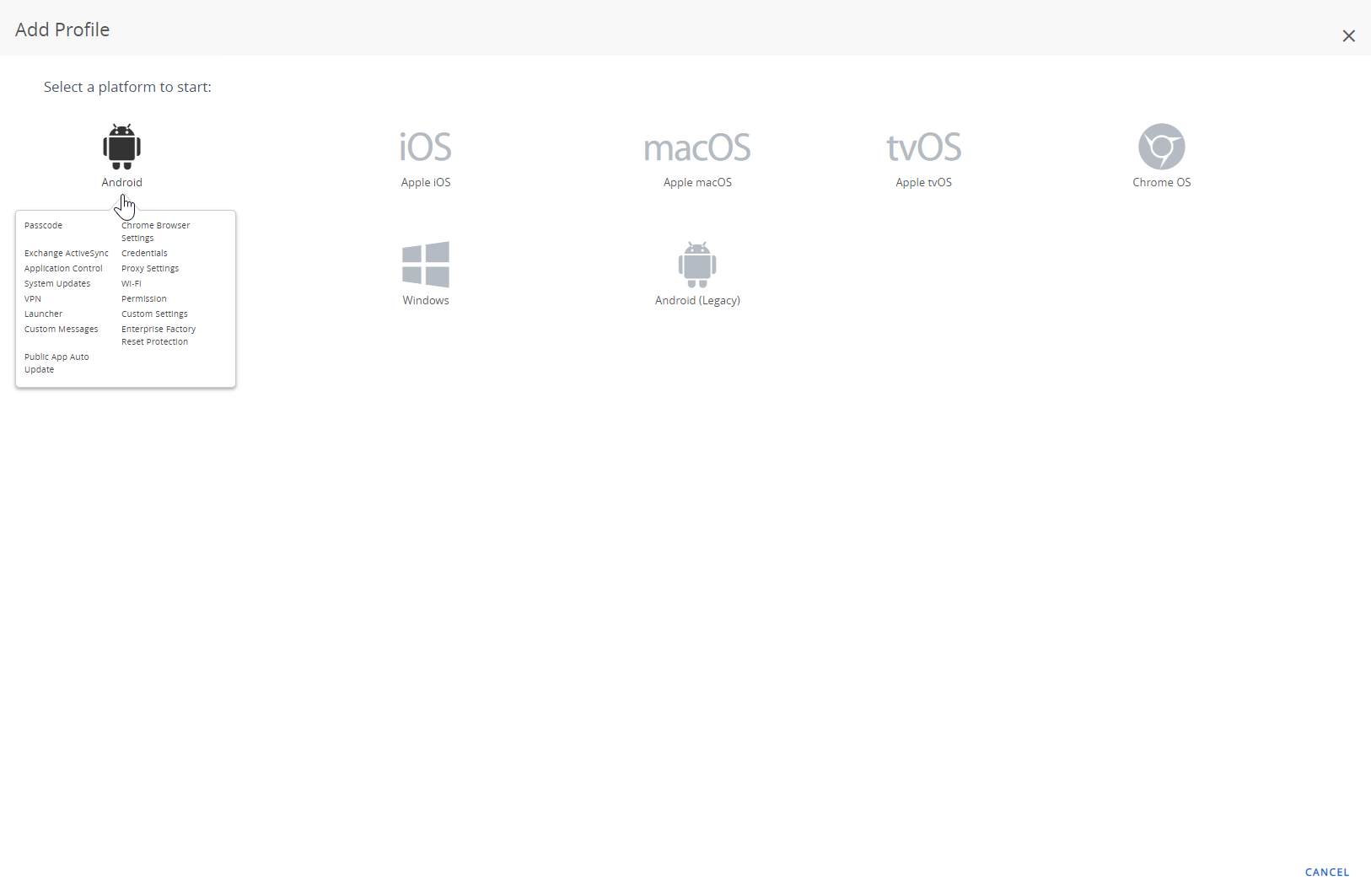 From the Workspace ONE console, modify an existing Android profile or add a new