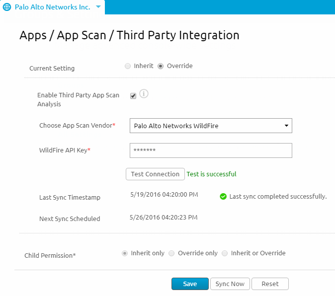 - Before you begin, obtain a WildFire API key. If you do not already have an API key, contact Support.From Workspace ONE, select Groups & SettingsAll SettingsAppsApp ScanThird Party Integration.Select Current Setting: Override.Select Enable Third Party App Scan Analysis to enable communication between Workspace ONE and WildFire.Select Palo Alto Networks WildFire from the Choose App Scan Vendor drop-down.Enter your WildFire API key.Click Test Connection to ensure that Workspace ONE can communicate with WildFire. If the test is not successful, verify connectivity to the internet, re-enter the API key, and then try again.